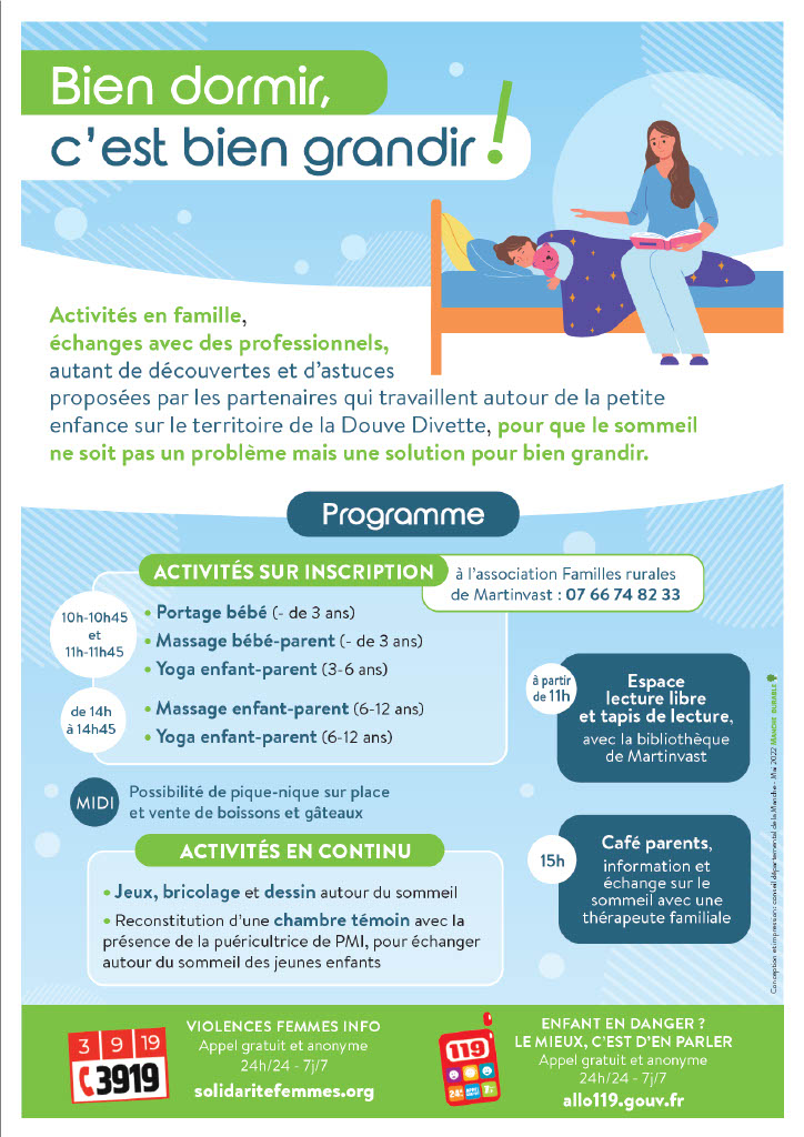 journée en familles « et si on dormait bien? » Le samedi 11 juin, ASLH (Accueil de loisirs sans Hébergement) vous propose une journée ou vous pourrez faire des activités en famille mais aussi échanger avec des professionnels. Autant de découvertes et d’astuces proposées par les partenaires qui travaillent autour de la petite enfance et de l’enfance sur le territoire de Douve-Divette. Pour que le sommeil ne soit pas un problème mais une solution pour bien grandir.